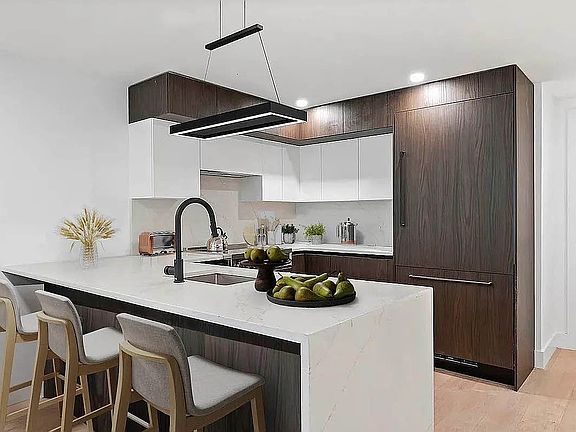 The kitchen features an eat-in waterfall peninsula, gleaming Marigold Quartz countertops and backsplash, custom walnut cabinetry from Scavolini, an Artos faucet, and integrated high-end Bertazzoni appliances including a state-of-the-art, eco-friendly induction range.