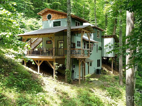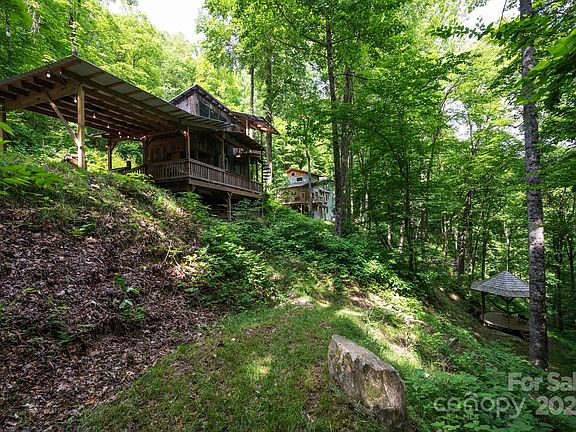 Treehouse-like home on tranquil and private 5.63 acres — with running creek and year-round mountain views. This special opportunity sits just 20 minutes from downtown Asheville or downtown Black Mountain. Property includes the unique main home, rustic cabin, gazebo, and fire pit; the perfect spaces for hosting your friends … or simply enjoying the peaceful quiet. The main home includes an ideal home office, a fun basement recreation room, and a modern, open floor plan. Custom tile finishes throughout the home include a beautiful mosaic tile behind the wood-burning stove, depicting nearby mountains. Perfect for a second home or for enjoying quiet, year-round living as the sellers do. Main house is over 2000SF combined when you include the non-contiguous home office/bonus room plus semi-finished and heated basement recreation room. See brochure, video, and floor plan for more information!