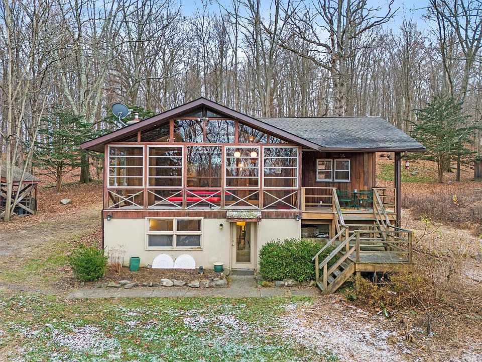Cozy Cabin on 4.9 Acres! Discover your perfect retreat with this charming cabin tucked away on 4.9 picturesque acres in the Washingtonville School District. Whether you’re seeking a peaceful getaway or a full-time residence, this property offers unmatched privacy and tranquility, all while being conveniently close to town and just an hour from NYC. The main level boasts an incredible sunroom with walls of windows, offering breathtaking views of the surrounding property. Step inside to an amazing living room with cathedral ceilings, a wood-burning fireplace, and floor-to-ceiling windows that bring the outdoors in.