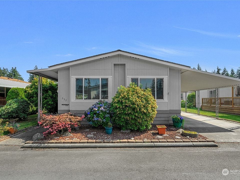 Welcome to Lago De Plata Villa 55+ community. Solid 2 bedroom, 1 & 3/4 bath home features open floor plan, vaulted ceilings, skylights, spacious dining room, family room and large kitchen. Newer stainless steel appliances. Spacious primary suite with walk in closet & ensuite bath. New windows, laminate flooring, skylights & ceiling fans. Separate utility room with washer/dryer(included in sale), sink and generous storage. Home equipped with central A/C and heat pump. Large storage shed w/cement floor, shelving & electricity in. Covered patio and garden space is perfect for outdoor enjoyment. Carport easily fits 2 cars. Clubhouse and seasonal pool to enjoy. Great central location close to parks, shopping, dining, hospitals & I-5.