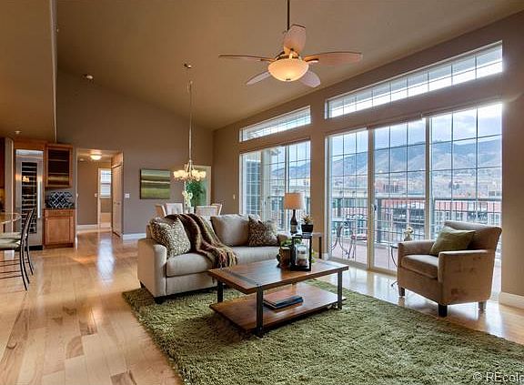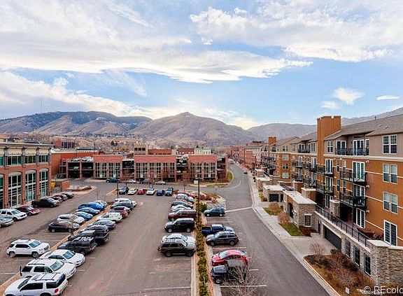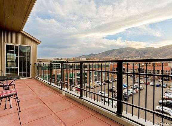 This may just be the best location in all of downtown Golden! This gorgeous penthouse faces west and offers magnificent views of Table Mountain and the "M"! Just steps away from everything that downtown Golden has to offer including the Community Recreation Center, Lion's Park, Clear Creek, walking and biking trails, shopping, and dining! This inviting, open floor plan is move-in ready! The gourmet kitchen has an island, slab granite countertops and stainless steel appliances including a Thermador wine refrigerator . The living room has vaulted ceilings, a gas fireplace and offers gorgeous views from the west wall of windows. The master suite has a private bath, generous closet space and a private entrance to the patio. The 2nd bedroom has a spacious walk-in closet. The 3rd bedroom makes a wonderful office and provides views from the west facing window. Gleaming bamboo floors. 29 x 6 patio. Secure building. 2 reserved garage parking spaces and a storage locker.