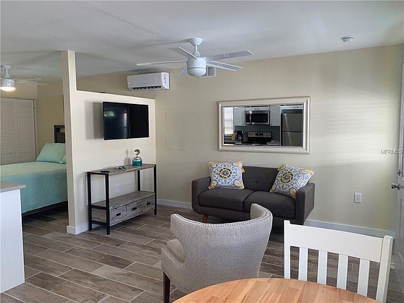 St Pete Beach adorable newly remodeled executive studio ready for immediate occupancy. This is a shorter term rental. Call for availability. The owners spared no expense when they remodeled. Tile plank flooring, no carpet! New stainless appliances, designer furnishings, private covered front lanai. End unit creates more privacy and great for those afternoon Sunday bbqs. Its located west of gulf blvd and on the beach block. there is an assigned parking spot. It's a quick short walk to one of the best beaches. No car needed here. You can walk to many restaurants and shopping. Elecrtic, Internet, water, trash, sewer and basic cable all included for a $150 fee per month plus rent..Hurry this will not last. Sorry no pets, no smoking.
