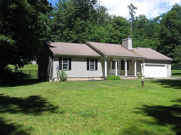 Beautifully maintained Contemporary Ranch set in its own private setting. Inside you will find gorgeous hardwood floors flowing thru the kitchen and living room. Spectacular countertops that include a grand kitchen island. Wait until you see this impressive, natural stone fireplace with propane insert that goes all the way to the cathedral ceiling height. What a great space to entertain your guests. The master suite is generous in size and has it's own full bath with very nicely done shower stall. The other two bedrooms are quite spacious which adds to the desirability of this home. Great, heated 2 car garage with extra work space and wash sink is perfect to clean up after your little projects around the grounds. Outside you will love the privacy of the large composite deck plus a covered/screened in section of it for those nights you want to sit out and enjoy the night. Fully fenced in yard with two gates on either side make this home one you don't want to pass up on.