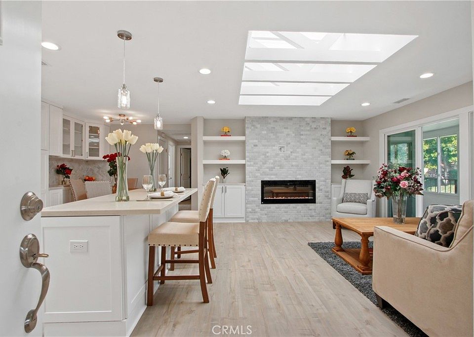 RENOVATED COOP! A recently renovated two bedroom, two bathroom home is now available and located in Laguna Woods Village, an HOA managed 55+ community within South Orange County, CA. NO EXPENSE WAS SPARED during the renovation of this popular "Casa Linda" floor plan. The home is ground floor/street level with no stairs leading to and from the nearby carport. The home features new plank style flooring along with premium tile/stone upgrades throughout. The upgraded kitchen features premium white shaker style cabinetry and includes stainless steel appliances. The living room has a massive skylight with exposed truss work and a custom built-in entertainment center with an electronic fireplace and is pre-wired for flat screen TV mounting. The master bedroom includes a walk-in closet, a private master bathroom with a generously size shower and floating bench. The guest bedroom features balcony access and a guest bath with a skylight for added natural sunlight. The home includes a stacked washer/ dryer and a recently installed central heating and cooling system. There is also a private enclosed balcony overlooking the neighborhood. There is a detached carport (#456-5) a short walk from the home and ample public parking spaces nearby. Laguna Woods Village is a thriving community with many activities to enrich your lifestyle! The monthly HOA includes property taxes, utilities (water, trash, cable TV), and maintenance of exteriors. *Unit is virtually staged.