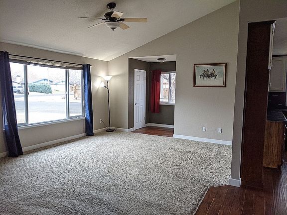 BEAUTIFUL HOME WITH OPEN FLOOR PLAN! This 3 bdrm/1.75 baths, 1427 sq ft, home has a large kitchen, dining, and living room with fireplace. Vaulted ceilings and a blend of carpet and beautiful hardwood floor enrich the living area. French doors in the dining room lead to a covered patio. Updated kitchen has ample granite counters, stainless steel appliances, and under-cabinet lighting. Custom-built hallway cabinets and updated bathrooms give this home comfort, style, and storage. The guest bath has a double vanity, and the master shower has plenty of elbow space. A large gate provides side yard access with concrete and RV parking. Two large sheds in backyard on slab with electricity make great workshop or storage space for gardening tools to use in the raised bed garden. Three mature trees provide lots of shade in the summer. The garage is finished and insulated. Roof was replaced in 2017. The home resides in a friendly neighborhood in walking distance to Upjohn park and Gateway Elementary School. Call Tasha at 435-512-1639 for showing information.