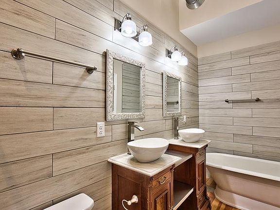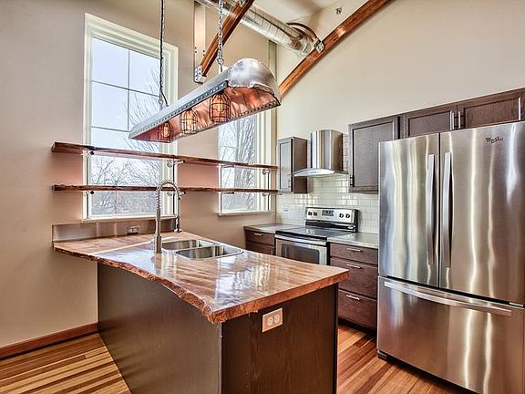 This renovated school in Fairfax was transformed with a mix of industrial and modern accents. Features include 14' ceilings, 8' windows, flowing natural light and open floor plans. All units have all natural wood flooring, gas or electric fireplaces, in-unit laundry, and custom tile work. All kitchens come furnished with stainless appliances. Unit #6 is a 2 bed 1 bath unit with separate rainfall shower and soaker tub. The large windows overlook the Fairfax park and ball field and walking trails. The open kitchen has stainless counter tops, live edge sycamore island, and live edge cedar shelving. Featuring rounded barn beam and steel cable ceiling and other custom adornments. Master bedroom walk-in closet. Contact us today to apply! No smoking, no pets. The application process includes full credit, background, and income verification. High end contemporary loft style apartment Unit #6. All utilities paid by tenant except trash.