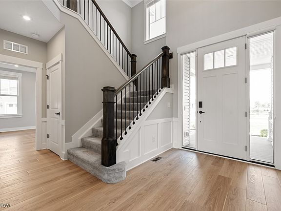 No need to build—welcome to the Skyview plan, thoughtfully designed to impress with its wide-open, light-filled layout and custom finishes throughout. Perfectly situated in the premier golf course community of Legacy Isle in Avon Lake, this home rests along the pristine 3rd hole, showcasing serene views of the pond, golf course, and wooded backdrop. The gourmet kitchen is a chef’s dream, featuring adjustable soft-close cabinetry with rollouts, hidden trash storage, double ovens, and quartz countertops. Entertaining flows seamlessly with luxury plank flooring, soaring 9’ ceilings, and thoughtfully designed gathering spaces. The main level also includes a spacious laundry and pantry area, a versatile office/living room, a planning center, and an oversized formal dining room perfect for hosting. Upstairs, the grand owner’s suite offers a retreat area, walk-in closet, and spa-inspired bath with custom details. Three additional bedrooms each include their own walk-in closet and attached bath, along with a versatile loft/game room. The fully finished basement provides exceptional additional living space with a full bath, dedicated craft room, and ample storage. Outdoor living shines with a covered porch, paver patios, built-in gas fire pit, and professional uplighting—all overlooking the pond and golf course for a truly serene setting. Additional highlights include a 4-car side-entry garage with a separate carriage bay, plus walking-distance access to the pool, clubhouse, golf course, and restaurant.