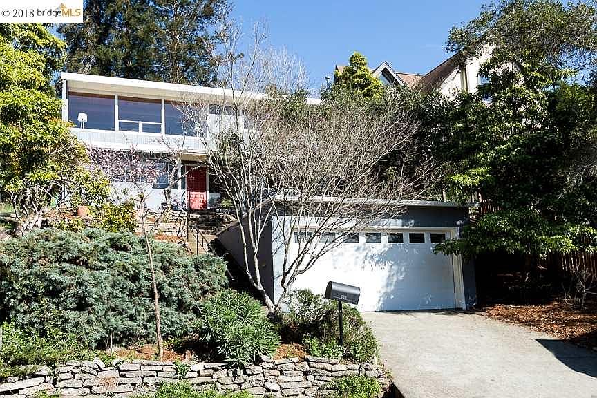Classic mid-century house built in 1958. Three bedroom 2 bath (1 ensuite) with panoramic views of Golden Gate and Bay Bridges. Exposed beams/wood-panel ceilings, hardwood floors. Additional living space on lower level, including a den/living space with second fireplace, and a separate office and laundry. Open plan kitchen/dining/living area leading onto covered redwood deck. Terraced back yard with red-wood retaining walls and concrete steps leading up to a large flat upper area with raised vegetable gardens and outstanding city views. Two-car garage at street level. Excellent location in Kensington, with a 10min walk to Colusa Circle (including supermarket, Benchmark Pizza, Kensington Pub) and a 5min walk to a supermarket, Ace Hardware, quality wine & liquor store and cheese shop in Arlington commercial district.