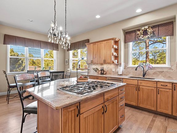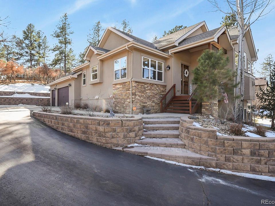 Gorgeous updated ranch home framed by towering Ponderosa pines! Vaulted grandeur in this stunning home showcases a spacious living room, chef's gourmet kitchen, main floor master suite and office / library. The living room features 16 ft cathedral ceiling. The gas fireplace and knotty alder built-in shelving create a cozy ambiance. Open kitchen and formal dining room provide ample room for entertaining. The chef's gourmet kitchen boasts slab granite countertops, spacious pantry, stainless steel appliances, and a breakfast nook. The bright and spacious master suite boasts a 13 ft vaulted ceiling with a barn door entry into a luxurious 5 piece master bathroom, with separate counters/ sinks. So many options with a finished walkout basement and a separate family room, 3 additional bedrooms, 2 private bathrooms, and ample storage space. Enjoy a night out under the stars on the private stamped concrete backyard patio including the relaxing sounds from the fountain, surrounded by forest--where you are sure to enjoy nature at its best, including breathtaking wildlife sightings! This home satisfies the longing to be “in the mountains,” but close enough to shopping and restaurants to be able to enjoy the best of both worlds! New Roof in 2023 and over $84,000 in upgrades!