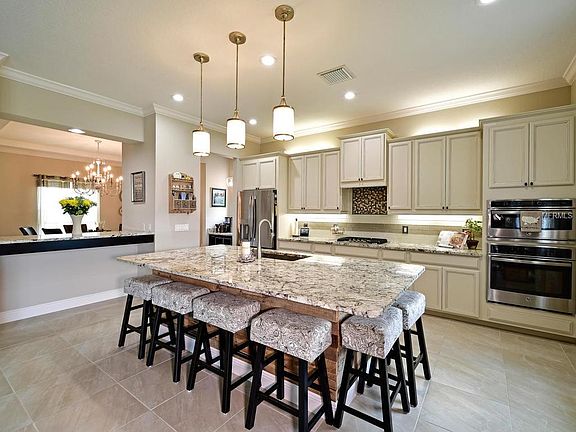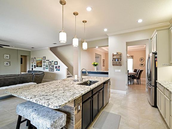 - Interior Features: Ceiling Fans(s), High Ceiling(s), Master Bedroom Downstairs, Crown Molding, Walk-In Closet(s), Open Floorplan, Stone Counters, In Wall Pest System, Thermostat