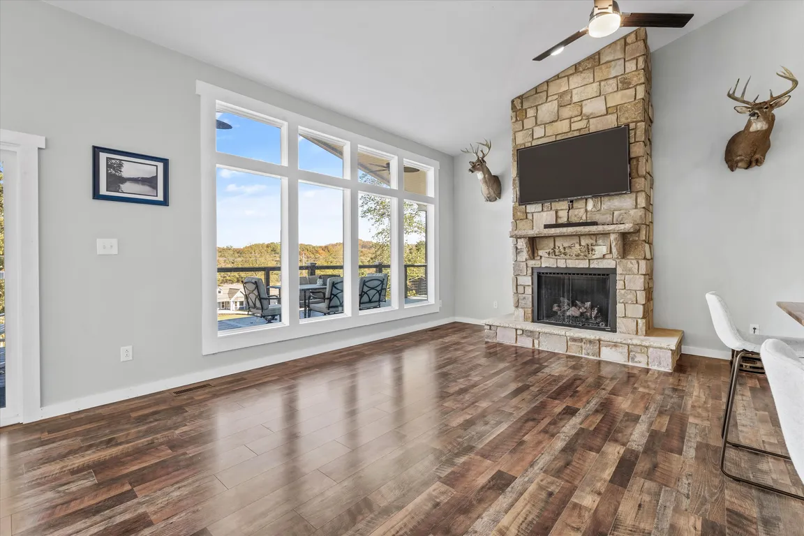 Cozy fireplaceDouble-level porch and patioStunning lake viewsCathedral ceilingExpansive lotExpansive windowsLuxurious en-suite bathroom