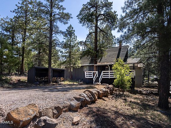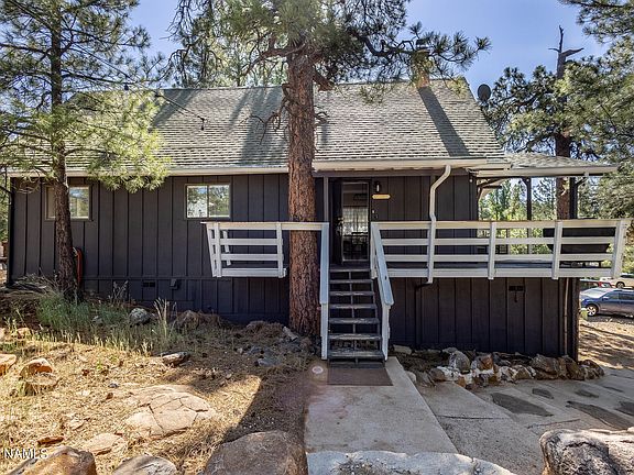 Sit and enjoy the beautiful pines from your front deck. Don't miss your opportunity to own this updated 3 bed, 1.5 bath home with an additional bunk-bed room. The bright spacious kitchen leads into the dining/great room with vaulted, exposed-beam ceilings. French doors off the dining room allow for great indoor-outdoor entertainment and the fresh cool mountain breeze to flow throughout the home. Situated on a spacious corner lot with only 1 neighbor to the East, the home boasts an attached 2 car garage and 2 parking areas to handle all the toys! The home is move-in ready and just waiting for you to make it yours!