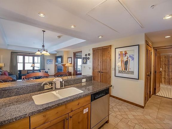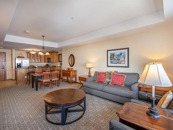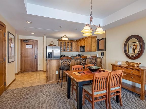 5th floor one bedroom two bath unit that looks right at the ski area and CB Mountain. Balcony catches the warm morning sun. Fully furnished and refreshed with carpet, sofa, chairs, stools, main bathroom countertop and mirror. Very good rental history and repeat return guests. Dogs are allowed with owners. Roomy unit with great views, gas fireplace, fully equipped kitchen, full size washer and dryer. Full guest bath, sofa bed, closet space. Underground parking garage. In the base area close to the lift ticket office, coffee shop, restaurants, ski shops, and transportation center. 888 finished square feet per assessor.