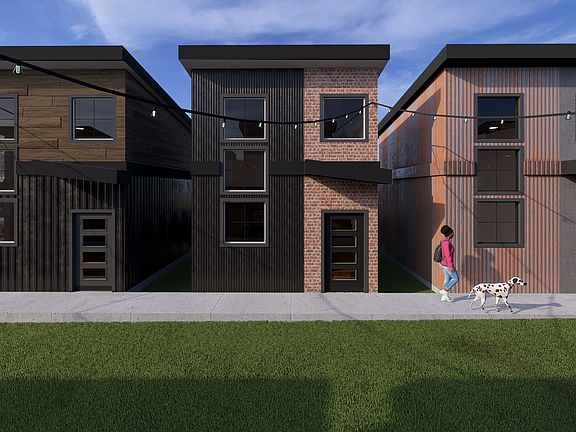 Steel Hollow features three distinct architectural styles, each showcasing a sophisticated blend of modern materials including rich brick, warm wood siding, and sleek corrugated metal cladding. The community's industrial charm is enhanced by carefully coordinated black gridded windows and thoughtfully placed accent elements, including striking circular design features that add visual interest to the streetscape.