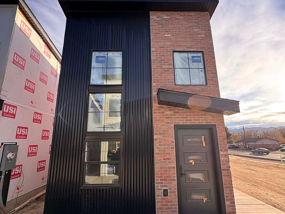 Exterior: A stunning combination of black galvanized steel roofing paired with authentic repurposed brick or brick veneer siding, all beautifully accented with SW Iron Ore trim. This model embodies timeless industrial charm with its rich brick textures and sleek metal elements.