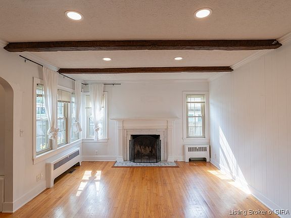 Welcome to this 4 Bed/2Full bath Bedford stone home conveniently located just minutes from downtown New Albany. Charm greets you at the door as you enter into the living area complete with fireplace, original hardwood floors, and exposed beams. The main floor also has 2 generous bedrooms, a sunroom, and kitchen that flows into the formal dining room. Upstairs has 2 more bedrooms and the second full bath. In the basement you will find laundry access and plenty of storage. Outside boasts well established landscaping complete with privacy fence, firepit and raised garden beds. A detached 2 car garage adds further value and convenience to this property. This home has been well cared for and is ready and waiting for its next owners. Schedule a showing to see for yourself!