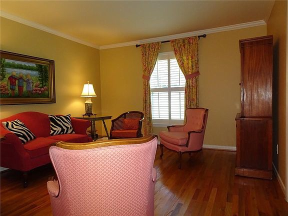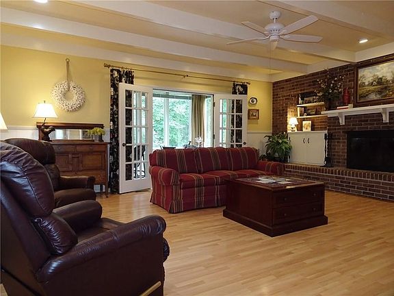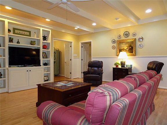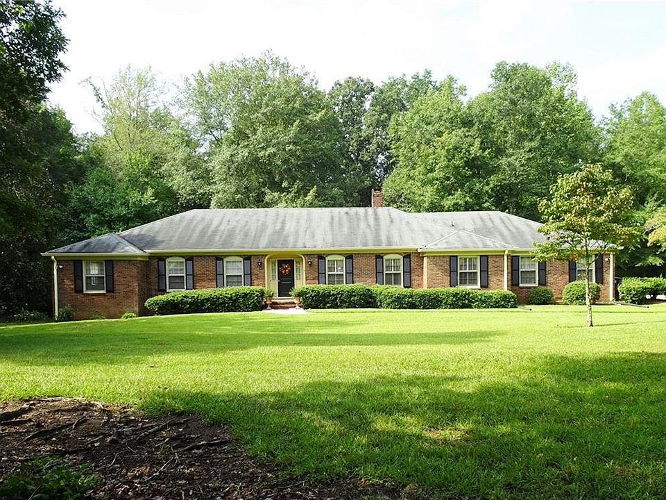 Beautiful setting and home. Well maintained, full brick 3BR/3BA ranch on 3.74 acre corner lot. Banquet-sized DR. Great Room with beamed ceiling, masonry FP, and built-in shelves. GR opens to a Vaulted Sunroom overlooking a private, wooded backyard with a creek. Eat-in-kitchen with with solid surface CT's, center island, and built-in desk. Den off of EIK. 3 spacious bedrooms/2 full baths on main. Daylight, partial basement with XL finished flex/bonus room, faux wood tile floors, kitchenette, and a full bath. Swim/Tennis community.