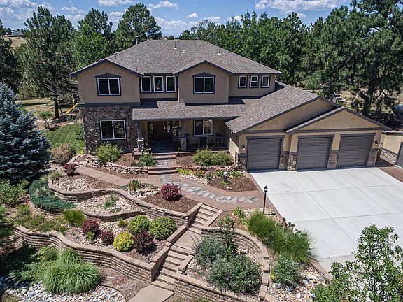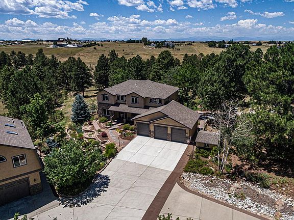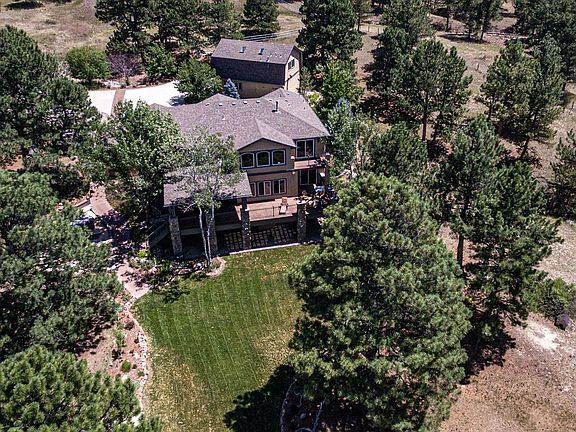 You have to see this 5 acre family retreat nestled in the trees at the end of the road. Privacy is no problem here. The main house has 6 bedrooms and 5 bathrooms with the main floor bedroom currently set up as an office. The main house has a large open family room and an island kitchen with direct access out onto the extensive covered deck. There is also a formal living room, dining room and wet bar to entertain guests before dinner. The walkout basement has a wet bar, billiards/game room, TV area, 6th bedroom, full bath and a partially finished craft room that connects to the storage room. Upstairs the master suite has a private deck to enjoy the views, his/hers closets, jetted tub and a walk in shower. The 3 secondary bedrooms upstairs have a full hall bath and one of the bedrooms has an ensuite bath. There is a private back staircase for the kids too. The Carriage House has parking for 2 additional cars, RV/trailer parking on the side and a full office or guest quarters upstairs. The office/guest quarters is fully equipped with a wet bar, microwave, bar frig, bath and fireplace. It's perfectly set up to run your family business from home. There are multiple outdoor living areas to choose from including a fireplace and hot tub patio and lower covered patio off the walkout basement. This home is a mere 8 miles to downtown Parker, Colorado. This is a great place to call home! The 2 propane tanks are leased.