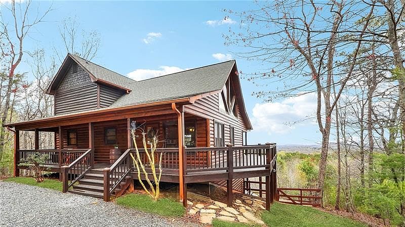 **Home is occupied, and shown by Appointment Only** Beautiful mountain home, with perhaps the most amazing views in all of Blue Ridge! Lovely log construction features sweeping long range mountain vistas from every vantage point, nestled on over two acres! Only minutes from Downtown Blue Ridge, Bear Claw Vineyard & Winery, and Mercier Apple Orchards. From the moment you walk through the door it feels like vacation, whether you use this home as a weekend get away, for rental income, or as your full time residence! This stunning three-level home features the Primary Suite with a private balcony deck; the upstairs loft area makes a perfect office area, but previously was used as another spot for a double bed or two twin beds, should a fourth sleeping area be desired. Another bedroom & full bath are on the main level, and a third bedroom and full bath are on the terrace level with walk out access to the pet-friendly, fenced backyard. Cozy up on cool nights with a mug of hot cocoa at one of the two fireplaces, or roast marshmallows under the stars at the backyard firepit. A glass of wine in the hot tub or on one of the upper decks taking in the long-range mountain views is also a great way to spend an evening! Recent home upgrades include new tankless hot water heater for never-ending hot water, commercial water filtration system, HVAC system updates with new furnace and new smart wifi-enabled thermostats, wireless security system with cameras for remote monitoring, backyard fencing and new fire pit area, gas logs for terrace level, new gutters/gutter guards, newer gravel driveway, newer stainless appliances, updated furnishings and linens. Home is being sold fully furnished, with very few exceptions. Completely turnkey, and no HOA! Well water & on-site propane keep monthly utility costs low! There is plenty of room on the spacious, two-acre lot to build a carport or detached garage, if desired. Square footage is approximate, as based on the tax records for combined above grade & finished terrace level. Come see this amazing home today, the mountains are calling! Access Instructions: There are two ways in and out, one is paved and the other is gravel. GPS will try to route via the gravel way, but this option requires a 4x4 and is not recommended. The paved option is best for easy access: Tennis Ct Rd/Sunrock Mtn Rd/Cohutta Overlook Dr/Cohutta Overlook Trail/Price Rd/Home on Left