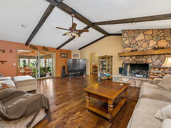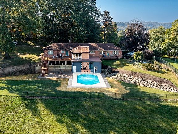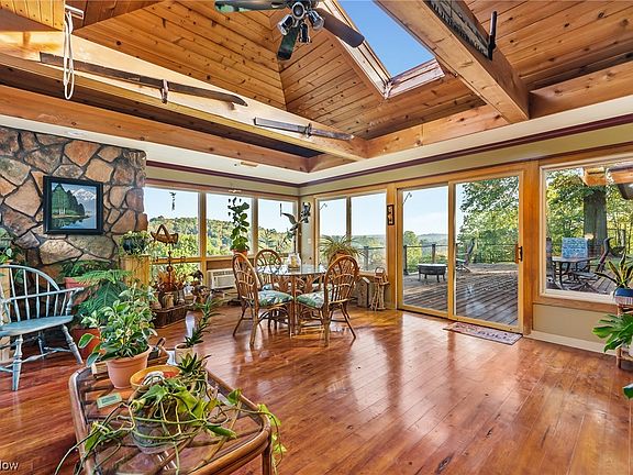 Looking for a country setting in a fabulous location with gorgeous views of sunrises and sunsets? Look no further, this home is a hidden treasure tucked away on your own 2.72+/- acre private sanctuary! Over 3,000 sq ft ranch with a wonderful living room, vaulted beam ceilings and stone fireplace that leads you to a rustic 4 season sunroom with cedar ceilings and hickory floors with a sliding door to a large deck. Spacious eat-in kitchen and dining room. Desirable split floor plan with a private master suite. Tons of natural light pouring in. Walkout lower level onto a beautiful patio with an inground pool overlooking the colorful Autumn landscape. 4 bedrooms, 3 bathrooms, 3 fireplaces and a high efficient furnace plus an attached wood burning furnace. Awesome hardwood floors and curved archways throughout the home. Being sold As Is.