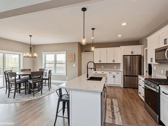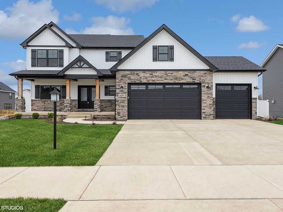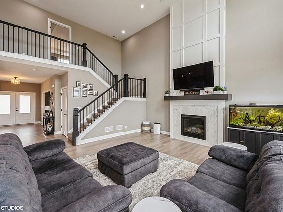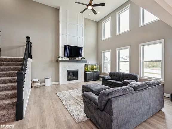 Olivia Design, 1 Year Young, Stunning 2 Story with 4 bedrooms, 3 bathrooms, 3 Car Garage, & secluded Fenced back yard. Main level offers oversized 2-story 18 ceilings in great room with Lots of windows, custom fireplace with impressive detail, pen concept Kitchen features sea sale medallion cabinetry, aspen gray quartz, large island/breakfast bar, walk in pantry, and spacious dining/eating area. Enormous den/flex room. Main floor laundry with utility Sink.. Beautiful Staircase leading to upstairs Owners suite with full bath, double vanity, 3 additional bedrooms and guest bath. Daylight basement can easily be finished with rough in for future bath. Custom finishes with upgraded siding and trim levels. Hunter Douglas, Electronic Blinds in great room & new blinds throughout. Ring Stays, Nest does not and will be replaced with a regular thermostat.Completely Landscaped with Huge, maintenance free deck and New vinyl fencing. Real Estate taxes should be approx $5,000 a year