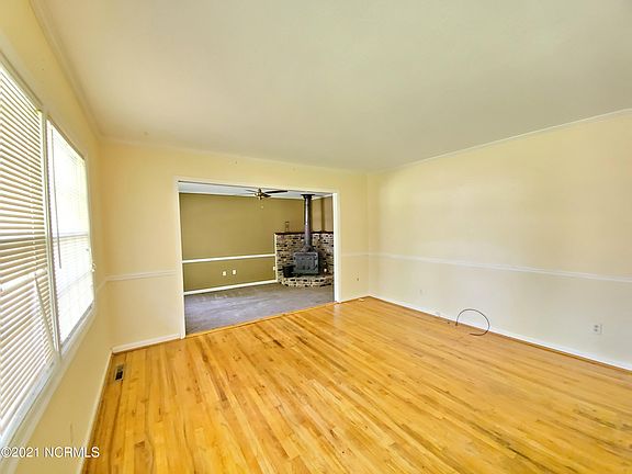 Adorable brick ranch in Ayden that backs onto a pastoral setting, inside, lots of hardwood floors, hug den with wood burning stove, U-shaped kitchen with dishwasher, peninsula with counter for stools, formal dining room, formal living room, 3 bedrooms with hardwood floors, remodeled hall bath and ensuite half bath in primary bedroom, and a laundry/mudroom leading out to a back yard patio looking over a shady back yard, the whole house is surrounded by mature trees and landscaping you can enjoy from your covered front porch.