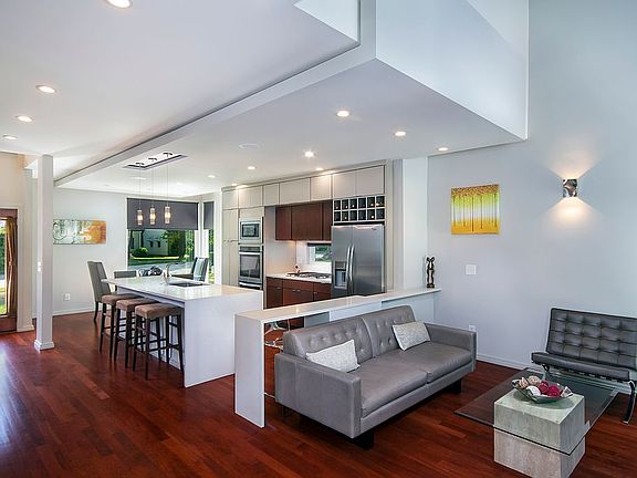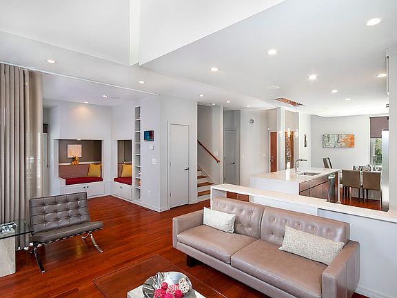 A modern home with an open floor plan designed by the owner-architect. The home features energy efficient design features and fixtures. Space efficient design features are also included.