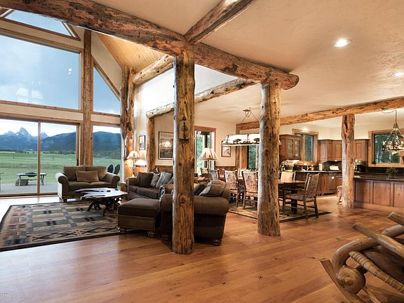 Absolutely stunning custom home on 42 acres of productive farm ground in Alta, WY. One of the 'Crown Jewels' in all of Teton Valley, this beautiful mountain retreat was built with the highest attention to detail and craftsmanship. Reclaimed materials used throughout, massive log accents, and walls of glass offer views of the Teton peaks from every room. A large kitchen opens into the dining and great rooms, perfect for entertaining large gatherings. The main floor master suite has private deck with hot tub, and 2 large guest suites on the second level. A dedicated office space can be used as a 4th bedroom if needed. Sleeps 10 easily. Fully ADA designed, this house has a two person elevator. The 1400 sq ft, heated, 3+ car garage offers room for every toy.