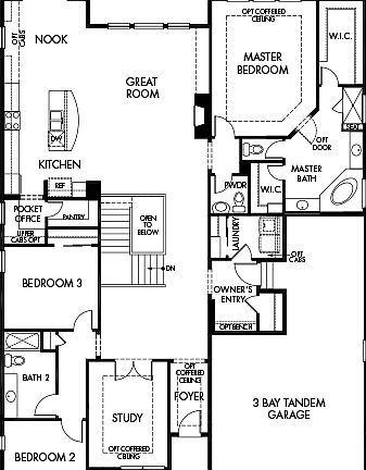 Gorgeous ranch plan with two bedrooms, two and a half baths and a three-bay tandem garage offers plenty of room for entertaining including a formal dining room with butler's pantry that leads to large center island kitchen. Spacious great room and cozy breakfast nook are great for quality family time. Study off the entry is ideal for home office.