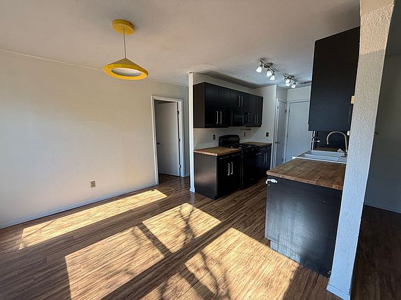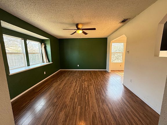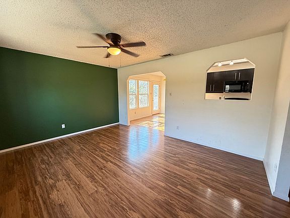 As you open the front door, you're welcomed into a warm and inviting living room filled with natural light. Rich wood-style flooring and a calming accent wall give the space a cozy feel, making it perfect for relaxing or hosting guests. Large windows bring in plenty of sunlight and create an open, comfortable atmosphere. The living room flows seamlessly into the kitchen, which features ample cabinetry, modern finishes, and a convenient pass-through that keeps the space feeling open while still defined. Just beyond the kitchen is a bright dining area, ideal for everyday meals, morning coffee, or casual gatherings with friends. Down the hallway, the bedrooms offer quiet, comfortable retreats with good natural light and closet space. Each room feels peaceful and well-sized, perfect for unwinding at the end of the day. The bathroom is clean and functional, designed with everyday comfort in mind. Step outside to a fully fenced backyard that provides privacy and room to relax, entertain, or enjoy time outdoors. The home also includes a two-car garage, along with a washer and dryer for added convenience. This home offers a thoughtful layout, cozy charm, and all the essentials for comfortable living in a welcoming setting.