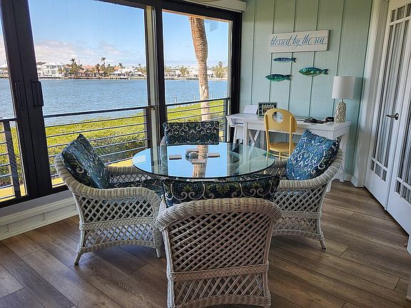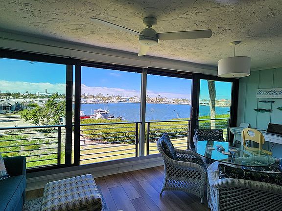 Beautiful open and spacious 2 bedroom, 2 bath condo with lovely bay view, completely remodeled in 2021. Enjoy your morning coffee with a view of the sunrise and canal, where manatees may be spotted. Relax and enjoy the sunset from the lanai or simply enjoy the view as fishing boats, dolphins, and birds (pelicans, osprey, eagles) make their rounds. This unit was remodeled in 2021. The remodel included new kitchen cabinets, countertops, new appliances (including an induction range), new LVP flooring throughout, and completely renovated bathrooms. Located in a quiet complex with tropical grounds, the complex includes a heated pool, hot tub and tennis/pickleball court. The city park is located a few steps away and includes a dog park, additional tennis and pickleball courts, and a basketball court. The boat ramp and pier are outside the Lanai window. The Lanai sliders are hurricane resistant and include a screen that may be lowered with remote. The buildings are 13 feet above sea level and are only two-story. This unit's second floor location means no neighbors above for quiet enjoyment. The Wi-Fi enabled front door lock and thermostat allow remote monitoring of unit.