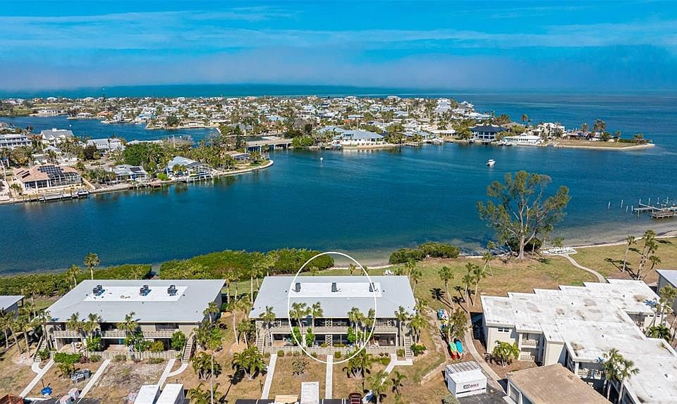 Beautifully renovated classy and tasteful waterfront condo with stunning views. Gorgeous new kitchen and baths. Hardwood and tile flooring. Recently renovated gorgeous kitchen with Kraftmaid upper Shaker cabinets and light maple lowers. Variegated quartz countertops. Beautiful Tuscan steel Samsung kitchen appliances four years old. Unique sea-foam sea-glass backsplash. LED ceiling and under-counter lighting in kitchen, living room and halls. Both bathrooms renovated in last four years - master with soaking tub easily convertible to a shower and master closet with built-in closet organizer. French doors from master to lanai with built-in blinds. Beautiful water views just lying in bed. Sip your coffee or wine in the lanai and watch herons, eagles and osprey daily in pine beside building and enjoy dolphin and manatee viewing feet away. Luxuriate sleeping in sea breeze flowing through your home. Quiet, dead-end lane set in park-like tropical grounds - the most open green-space on Anna Maria Island. Screened in porch. Pool with spa, outdoor, shower and restrooms. Tennis court with two pickleball courts. Grill patio. Common-area dock and benches. Sandy beach directly in front of building. Kayak storage areas - slip your kayaks right into the water by condo. Two year-round owners live in building giving added security. Bike storage areas. Just 5 minute bike to beach. Excellent hurricane security with perimeter fully protected by Miami-Dade hurricane sliders, window and entry door. No damage to unit or water intrusion from hurricanes. Brand new roofs on all eight Association buildings installed in 2025. Built 1980. Buildings are 13 ft above sea level and are only two-story with just three units each floor. Second floor condo. Association includes Spectrum cable tv and high speed Internet, and water, sewer. LED dimmable lighting in kitchen, halls and living area. Association fully reserved. Very well-run by same capable and friendly manager for 40 years. 48 units. Condo is easily rentable by the month. Home is available to close and move-in this April or May. Home conveys with kitchen appliances and LG washer and dryer. Not furnished.