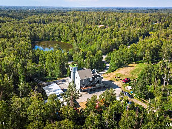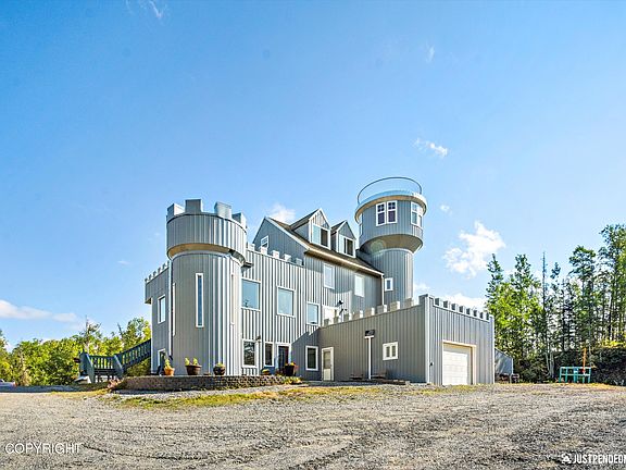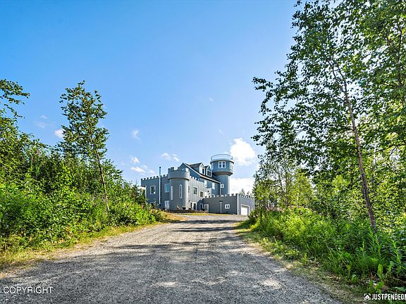 Kings & Queens! Be it your royal prerogative to reign over 4.67 unrestricted acres and occupy this 4,149sf fortress boasting majestic 360 degree views? Enjoy mountains from every floor through the many windows all the way up to the 6th story turret! An overbuilt steel & iron two story deck reaches the fully equipped 3rd story MIL apartment. No HOA/CCRs. 10 minutes to Hatcher Pass or Palmer.Unobstructed views of Pioneer Peak to the south overlooking an ice skating pond across the street. Close up views of Hatcher Pass to the north. Considerably large yard, ample parking, and hefty steel gates secure both horseshoe driveway entrances. The land to the north is uncleared but suitable for further building however you desire. Enjoy this incredible home with your family and offset your mortgage with passive income from the apartment above, or build a kitchen on the first floor and have your first triplex completed on the property with plenty of room for more. 1st floor - north and south entrances, 3 beds, 1 full bath & wood stove. 2nd floor - kitchen, 2 bedrooms, 1 full bath with jetted tub. 3rd floor - 675 sf private entrance studio apartment with full bath and full kitchen has amazing views and is ready for long/short term rentals or visiting family guests. Finished with tasteful rustic/industrial touches. 4th floor - Bonus room with incredible views! 5th floor - The tower is the final interior floor and is arguably one of the coolest and most unique hangout spots in the Matsu Valley, with brushed iron work, bowling lane flooring, and panoramic views. 6th floor - Up top! 576 sf 2 car garage 17x12.5' shed stays with the property. All other materials, equipment, and shipping containers will be removed prior to sale. 40x20' Steel shop with two 8.5x12.5' doors. The pitched roof is 13' from the front. Expansive south and west-facing decks are sealed properly with torch down roofing and pitched slightly for functional gutter draining. Install your choice of decking and entertain the whole village. The burly north-end steel deck requires little to no maintenance. Forget painting and shoveling! There are several freshwater springs below the home near the street that continuously spout water year-round. This property's well produces the purest water in all the land. Seriously, it's really good water. Every floor has 3/4" plywood on top of the existing 5/8" making for silent steps and sturdy construction. New pressure tank, well pump, and top-of-the-line on-demand hot water heater.