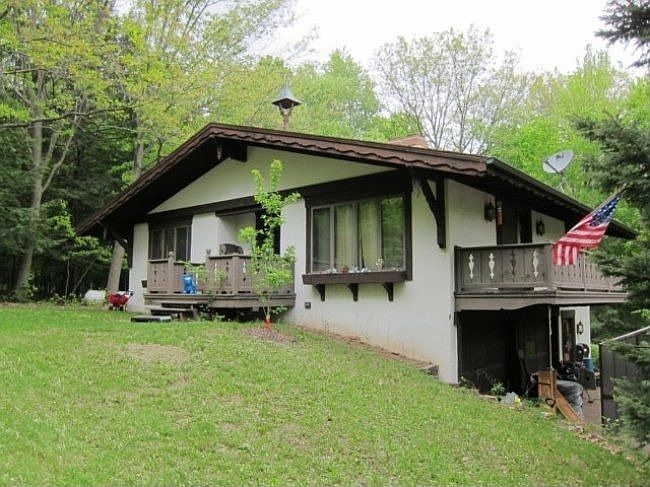 Warm, private, and unique describe this one-of-a-kind Swiss Chalet-style home nestled on 8 wooded acres. Enjoy the pond, wooded trails, abundant nature, and outdoor living just a short distance from shopping, school, and the highway. The solidly built home features a woodburning fireplace, oak plank wood floors, step-saver kitchen with built-in dining table, main floor laundry, office, family room, and the comfort of home.