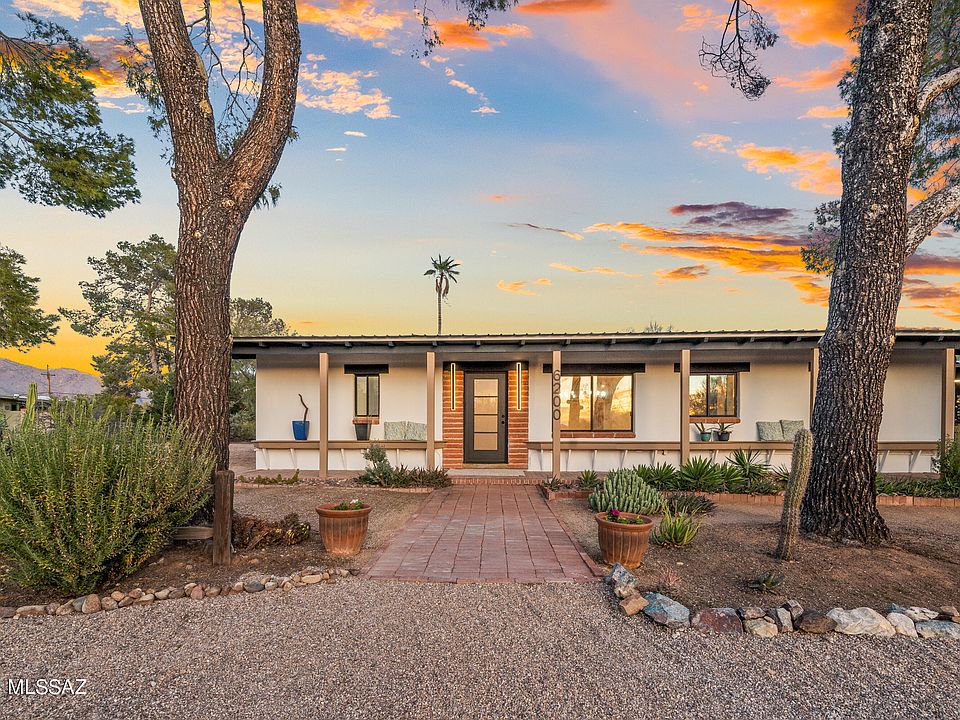 Beautiful remodeled ranch hacienda 2816 SF w/modern finishes. Gorgeous all-new gourmet kitchen & updated baths. Three bedrooms all w/private baths and one additional 1/2 bath. 864 SF separate guest house w kitchen and private bed/bath could be rental, office, or mother-in-law. Main kitchen opens to the family room w wood burning fireplace. Big dining room & separate bonus space for game/playroom or den. New exterior doors, lights, & plumbing fixtures. Metal roof. No HOA! Total 4 bedrooms and five baths. Two courtyards off main home. The neighborhood has a suburban feel, but it's just one mile from Oracle Road and NW Medical. Least expensive 3500+ SF single level home on 64,000+SF lot in all North Tucson. Next similar active comp $1.695MM!Owner is a licensed AZ real estate agent.