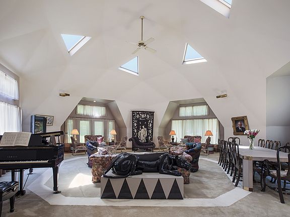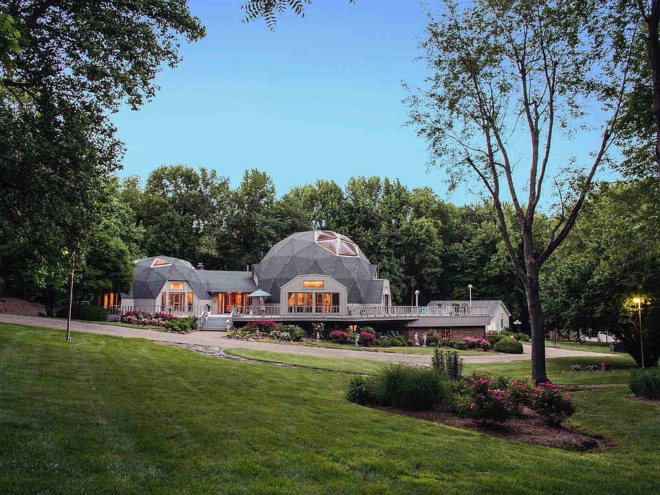Evansville's preeminent geodesic dome house is on the market, and it's time to see it in a new light. Designed in 1981 by local husband and wife team Dr. Sandy Schen and restauranteur Jacquie Schen, no other home offers the perfection of early 1980s/1990s high-end contemporary design, immense scale, and an oasis of landscaped acreage on Newburgh Road. With two domes, one soaring to nearly 28 feet on the interior, the roots of Buckminster Fuller are twice as prevalent here. Featuring over 12,000 square feet of living space, the home's major goal is prevalent throughout: to entertain family and friends, both near and far. The main level is flooded with natural light, bringing the outside in to the home's three formal dining areas, two master suites, executive library, and the living area in the smaller dome - large enough for dining, sitting, and a concert grand piano. Domed ceilings show the signature transition from hexagons above to pentagons below. Custom art made for the home graces the soaring stairwell, while the open kitchen with commercial grade appliances anchors the heart of the home. The original master suite sits just off the kitchen and cork-floored dining area and works perfectly for private guest quarters. Featuring a vibrant accent wall of hand-painted French wall-paper, the home's original thrust of contemporary design is clear here - from clean contrasting tile floor, white track lighting, and en suite with Corian shower and soaker tub. The curved kitchen opens into the enormous 1990s addition, which includes a second open access to the finished basement, a vast entertaining and living area, and a Las Vegas worthy master suite boasting his and hers walk-in closets, copious amounts of Corian in the tub surround and walk in shower, and a walk-out to the inn-worthy rear covered deck. The home's three other bedrooms lie in the larger of the two domes, each with their own loft spaces, two connected by a Jack-and-Jill bathroom. Below grade, in the expansive walkout basement, sits a billiards area, executive office, 4th dining area, entertainment space with wet bar and dry bar, guest suite, music/theater room, and wine room. Outside, the original pool house welcomes you into a focal point of entertaining and hospitality with kitchen, guest suite, and open living area - all walking right out to the diving board, the home's sunset view to the west flanking the entire resort of architectural experience. Two domes. Two words. Geodesic deliciousness.