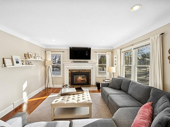 The main level boasts two bedrooms with original hardwood floors and a full bath. The lower level offers a versatile family room with a second gas fireplace, built-in bookcases, and ample space for entertainment. Two additional bedrooms, a ¾ bath, and a convenient laundry room complete the lower level.
