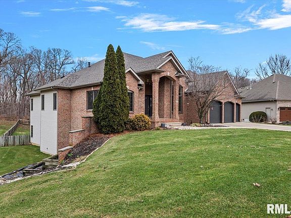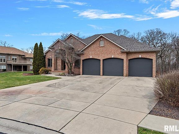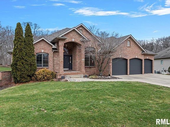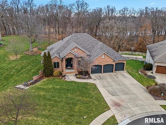Discover this stunning ranch home nestled on an exceptional cul-de-sac lot, backing to serene private woods and an inlet of Lake Springfield. The expansive lot offers the ultimate privacy and ample space for a pool, creating your dream backyard oasis. This home boasts 4-5 bedrooms, 4 full bathrooms, and a thoughtfully designed walkout lower level, perfect for entertaining or comfortable everyday living. The main level features soaring 14-foot ceilings in the kitchen, living, and dining areas, complete with elegant built-in shelving for added charm. The spacious, open-concept kitchen is a chef’s delight, showcasing granite countertops, stainless steel appliances, a walk-in pantry, and direct access to the inviting sunroom with picturesque backyard views. Retreat to the main floor primary suite, where you’ll enjoy a tranquil view of the lush backyard, a spa-inspired bathroom, and a generous walk-in closet. Additional main floor highlights include a private office and convenient laundry room. The lower level is designed for fun and function, featuring a built-in theater screen and projector, a wet bar, a recreation area, and a gym that can easily transform into a fifth bedroom. The fourth bedroom on this level includes its own private bathroom, while abundant storage space adds to the home’s practicality. Additional features include a transferable home warranty, a new roof installed in 2023 (with warranty), and a spacious 3-car garage.