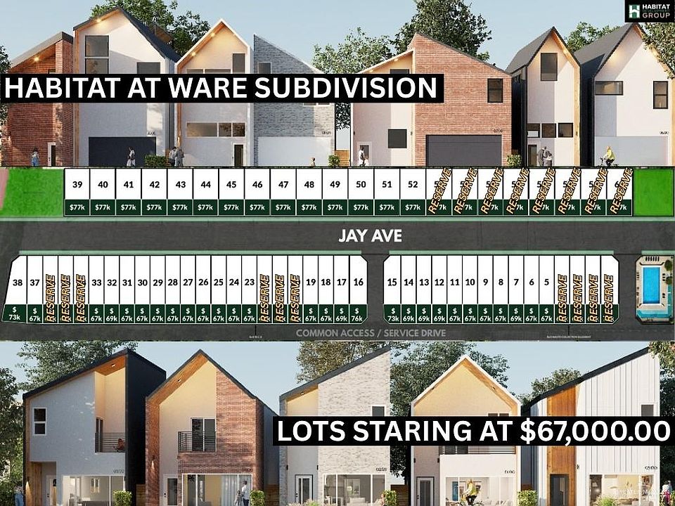 Welcome to Habitat at Ware a unique subdivision that offers 60 Lots with 9 different designs for buyers , builders and investors to select.