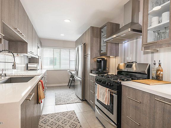 Tasteful designer, perfect remodel in this large three bedroom, three bath home in one of the areas best managed HOAs (Villa Granada) in the thriving West Valley Warner Center area. This beautifully remodeled 3+3 offers the serenity of a private home with plush gardens and private pool in the resort style common area, while the outer unit location makes it the perfect unit for entertaining. Inside the home, the large living room greats you with high ceilings and tile flooring. Wood steps up to a formal dining room with butler pantry featuring wine fridge, glass cabinets and shelving. The open kitchen has quartz counters, stainless steel appliances, computer area and beautiful cabinetry. This floor has your first bedroom, currently used as a play room and tub bath with glass top vanity and