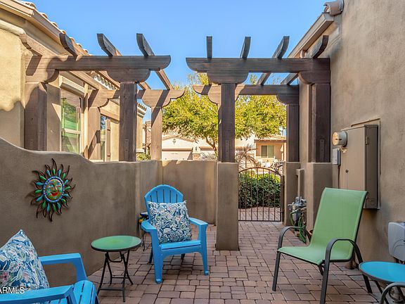 Welcome to your new home in the sought after gated golf community of Tuscany Villas at Painted Mountain. This home features a front paver patio for chatting with neighbors, and private back patio for quite time. Inside you will find a open floor plan with tile in main living areas, and wood flooring in bedrooms.! Stunning cherry cabinets and granite counters offer plenty of storage & prep space! Laundry room is plumbed for sink. Living/dining room combo allows the open flow from the kitchen to back patio. Tall ceilings, plantation shutters add to the beauty. Split floorplan for bedrooms for privacy. Main bedroom provides bay window, dual sink ensuite & full shower. 2nd bedroom has full bathroom as well.