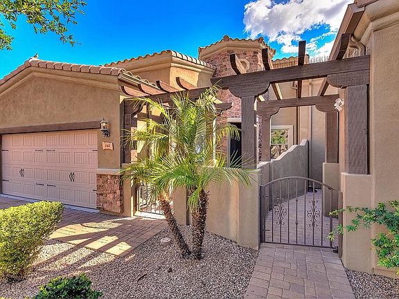 Desired GATED Tuscany Villas with Old World architecture-this charming ''Roma'' model is one of the rare homes with it's own DEEP Private Pavered Driveway. Enjoy your private front courtyard and entrance to your 2 Bedroom Ensuite Villa! This Original Owner has lightly lived in the home about 6-8 weeks a year. Large Plantation shutters in the Great Room and Dining room. Open Floorplan perfect for gathering of family and friends. Oversized Tile in Kitchen/Dining/Greatroom/Laundry and Baths. Freshly cleaned neutral carpets in both Bedrooms! Kitchen with Gas Stove, Kitchen Breakfast Bar to stay connected while visiting and preparing meals. Master Bath with Dual Sinks, Walk in Shower and Walk in closet. Arcadia Door leads to Private Backyard Pavered Patio with Fruit Trees and Low Maintenan