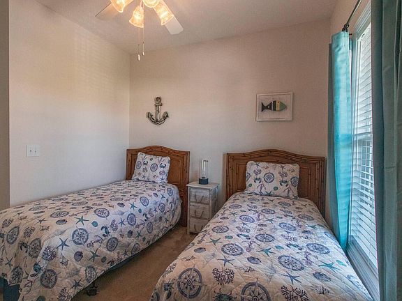 Find twin beds in the second bedroom, along with a 32" Samsung smart TV, ceiling fan, abundant storage, and a mirrored closet.