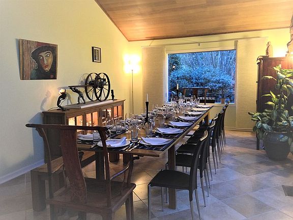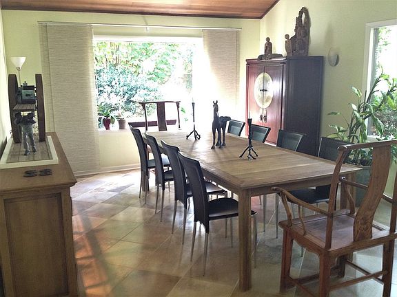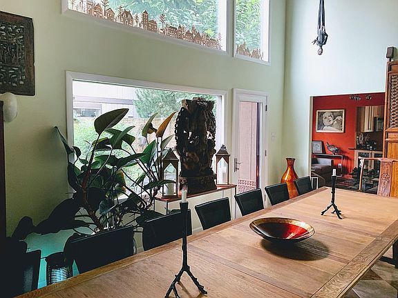 This California style contemporary house is full of light and located in a cul-de-sac inside the Washington beltway and has modern amenities such as a never-ending hot water supply and a new air conditioning and heating system, a high ceiling dining room that sits up to 16 guests, two stone fireplaces, three gorgeous full baths and an efficient kitchen with unique Red Dragon granite countertops, maple wood and glass cabinets and brushed stainless steel appliances. The four-bedroom house has a master bedroom suite on the main floor with jetted bath, full shower and a walking closet and has direct access to the heated pool and garden. In the private garden, surrounded by brick walls and backed by trees there is an outdoor kitchen, an outside hot water shower and a covered toilet room.
