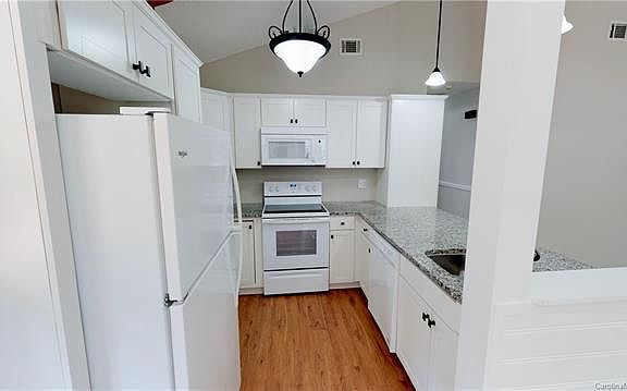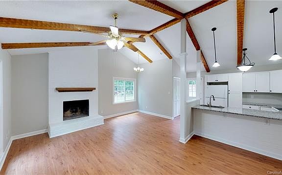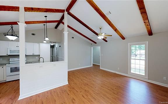 Charming 3 BR / 2 Ba ranch home in Hemby Bridge - Indian Trail area. No HOA. New vinyl plank flooring and paint throughout interior. Clean white kitchen cabinets with granite countertops. New refrigerator, range and built-in microwave. Vaulted ceiling with wood beams. Rocking chair front porch and new front landscaping. Fenced rear yard. Rear patio and fire pit area. Large partially finished storage shed and additional storage building located near back of property.