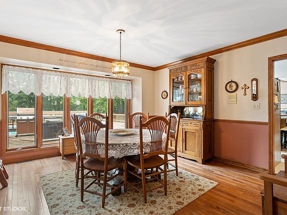 Spectacular country home set on beautifully wooded park like setting with 3.9 acres and a pond! You will immediately feel the warmth of the home when you enter the home. Gorgeous hardwood floors throughout most of the home, six panel door, crown molding and oak trim are just some of the amenities. The spacious living room is a great place to entertain friends and family and features built in bookcases and a stone woodburning fireplace. The dining room is perfect for hosting holiday parties and opens up to the rear deck, heated sunroom and the screened-in porch to give you even more room. The chef in you will appreciate the large kitchen featuring stainless steel appliances, a double oven, granite counters, center island, skylights with remote shades, and an eating area spacious enough to accommodate a large table. The upper level features 4 bedrooms and the impressive master suite boasts beautiful hardwood floors, lots of closet space, and an oversized sliding door leading to a private balcony. Soak your worries away in the master bath whirlpool tub and stargaze through the skylight above. The lower level family room gives access to the aggregate patio that leads to the backyard. If you need extra storage, want a private workshop, or just want some extra living space, the 33x30 sub-basement is perfect! Summer fun is right outside the rear of the home featuring a 36x18 pool that is surrounded by an expansive and multi-tier deck including a pergola and bar. Kids (and adults) will love the zip line! This well-kept and comfortable home makes it one to seriously consider. Terrific location with easy access to major thoroughfares and shopping. Just a short ride to the Chain of Lakes and southern Wisconsin. E-3 zoning and a sizeable shed for all the extras.