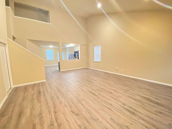 Charming two-story home in the desirable Forrest Bluff neighborhood. This 4-bed, 2 -bath residence features an open living area with high ceilings, new vinyl flooring in the living areas and kitchen, and freshly painted walls throughout. The spacious kitchen includes granite counters, stainless steel appliances, a microwave/oven combo, and included refrigerator. Conveniently located: primary suite on main level, walk-in closet, and main-level laundry. Fully fenced private backyard backs to green space ideal for privacy and relaxation. Includes attached two-car garage.