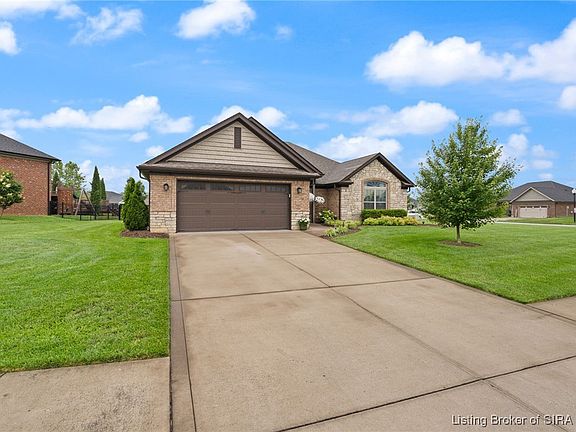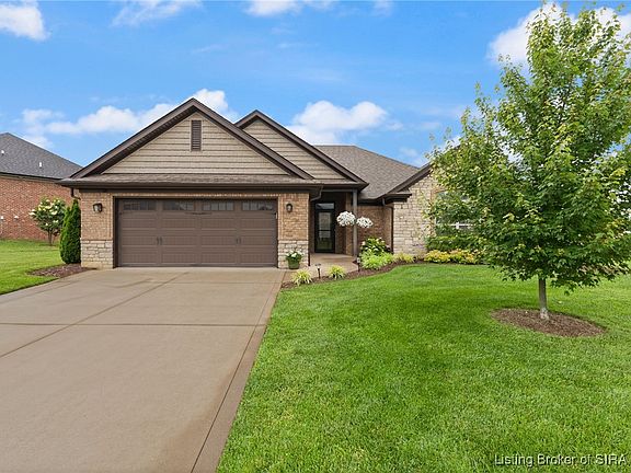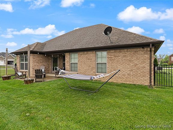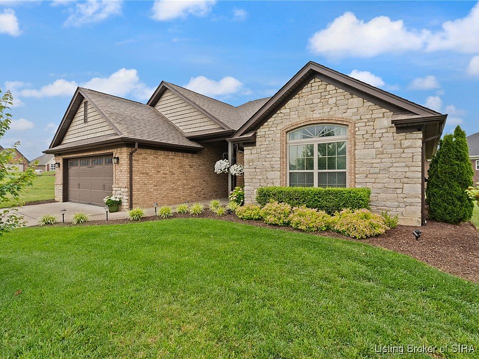 Don't miss this beautiful home on a spacious corner lot in the highly sought-after Hawthorn Glen neighborhood. With its classic brick and stone exterior, charming curb appeal, and vibrant landscaping, this home is a standout from the start. Step inside to find engineered hardwood floors and a bright, welcoming foyer accented with board and batten details. The living room impresses with vaulted 10-foot ceilings, crown molding, and large windows that bring in plenty of natural light. At the heart of the home is an open and airy kitchen, complete with stainless steel appliances, a pantry, a farmhouse sink, and a cozy eat-in dining area. Just off the kitchen, a patio door leads to a covered concrete patio adorned with string lights - perfect for outdoor dining or gatherings. The owner's suite is a peaceful retreat, with a tray ceiling, a generous walk-in closet, a double vanity, and a jetted soaking tub. Two additional bedrooms and a second full bath complete the split floor plan. Outside, the fenced-in backyard includes newly added landscaping, offering both privacy and a peaceful outdoor retreat. An attached two-car garage adds convenience and extra storage. Residents of Hawthorn Glen enjoy access to a community clubhouse and pool. The neighborhood is just 15 minutes from Louisville. Perfectly situated between Sellersburg and Charlestown, the neighborhood is close to dining, entertainment, shopping, and more, offering the best of both small-town charm and big-city convenience.