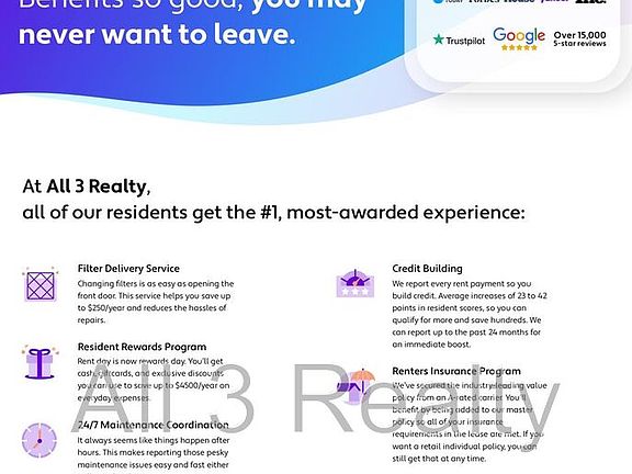 All 3 Realty residents are enrolled in the Resident Benefits Package (RBP) for $35/month which includes liability insurance, credit building to help boost the resident's credit score with timely rent payments, HVAC air filter delivery (for applicable properties), our best-in-class resident rewards program, and much more! More details upon application.