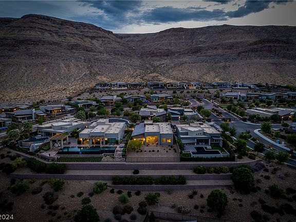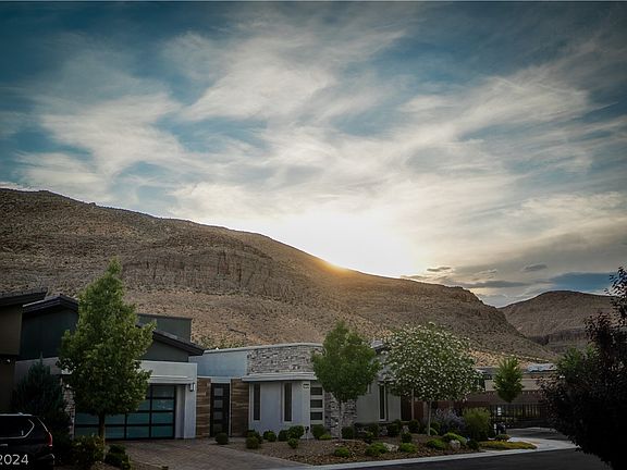 Step into this gorgeous, nearly new home offering stunning panoramic views of the city skyline, Las Vegas Strip, and majestic mountains. Entertain in style in the spacious living room adorned with vaulted ceilings and a captivating fireplace, perfect for cozy evenings or gatherings with friends and family. Experience seamless indoor-outdoor living with retractable glass doors leading to the covered patio, overlooking the meticulously landscaped and easy-to-maintain backyard. The heart of this home is its large gourmet kitchen, featuring a grand island, sleek stainless-steel appliances, and abundant cabinet space. Retreat to the private master suite boasting a lavish master bathroom with dual sinks, a generous walk-in closet, and a luxurious walk-in shower. Additional bedrooms offer comfort and privacy, with one featuring its own private bathroom. Convenience meets elegance with a separate laundry room and the allure of a move-in-ready home awaiting your personal touch.